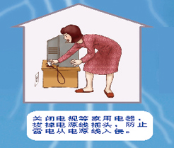 室内防雷 1、紧闭门窗,防止球形雷电侵入室内。 2、千万不要接触天线、水管、铁丝网、金属门窗、建筑物外墙,远离电线等带电设备或其他类似金属装置。 3、雷电发生时,家庭使用的电器例如电视、音响、冰箱、影碟机等应停止工作,切断与室外连接的所有导线,拔下天线插头和电源插头。