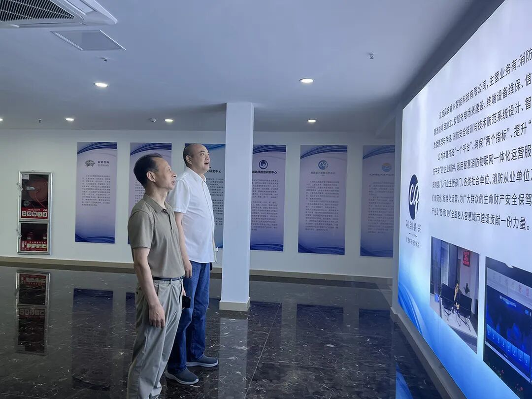 协会理事单位萍乡市消防协会会长、江西昌启睿兴智能科技有限公司总经理左辉热情接待并陪同考察。左总介绍了公司的基本情况、经营理念、发展方向等,他表示:公司主营业务是做消防物联网平台值守、智慧消防项目施工、智慧充电场景建设、终端设备维保、信息技术咨询、互联网数据管理与存储、消防安全培训与技术防范系统设计、智慧消防研究与管理等,有些业务的开展还正处起步阶段,希望以后能够得到协会的指导和支持。随后参观了智慧消防值守中心。